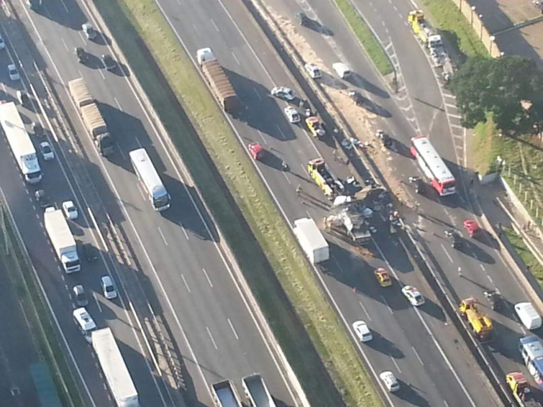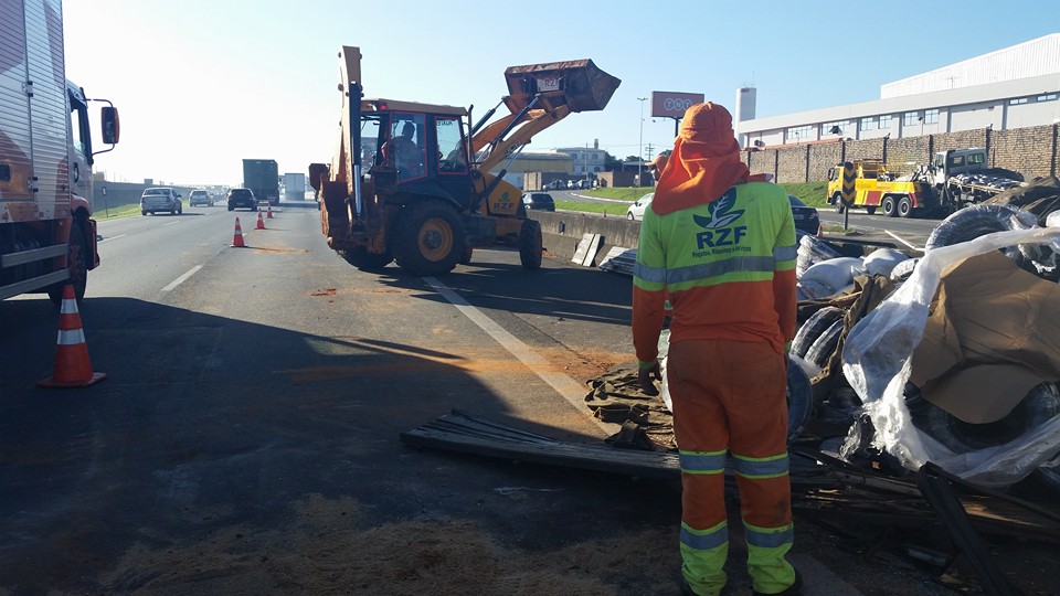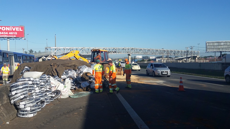 Um dos caminhões chegou a ficar atravessado na pista, com interdições de faixas na pista expressa e marginal. A equipe de socorro da rodovia espalhou serragem na pista para evitar que o combustível dos veículos pegue fogo.