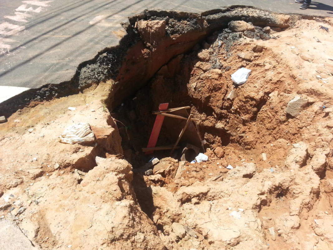 O problema começou em novembro, depois que parte do asfalto se soltou por causa da chuva. Algumas semanas depois, a terra cedeu por causa de um veículo estacionado. A prefeitura fez o reparo no local, mas logo em seguida uma adutora subterrânea rompeu e a cratera se abriu. Até a placa de alerta colocada pela prefeitura foi parar no fundo do buraco. Morador da Rua José de Lima Piauhi Dourado, Gamaliel da Costa, fica preocupado com a situação, porque existem crianças que moram próximas do local. Segundo ele, caso o problema não seja resolvido, a tendência é que o buraco aumente ainda mais, uma vez que já surgiram novas rachaduras no asfalto.