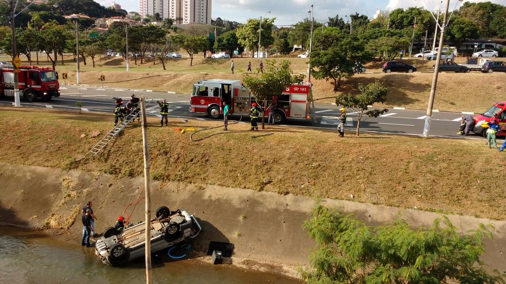 Uma mulher de aproximadamente 34 anos capotou o carro que dirigia, um Pálio Weekend, e caiu dentro do córrego do Piçarrão na tarde desta terça-feira, em Campinas. Ela trafegava pela avenida Dr. José Roberto Magalhães Teixeira no sentido Jardim Nova Europa quando perdeu o controle da direção. Além da motorista, um menino de seis anos de idade estava na cadeirinha no banco de trás.