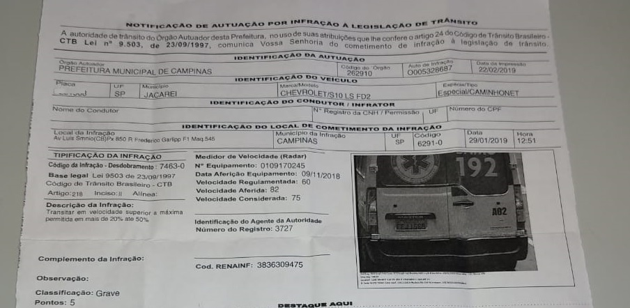 Um morador de Jacareí foi surpreendido ao receber uma multa que diz não ter cometido na Avenida Luiz Smânio, no bairro Vila Nova, em Campinas. O problema maior não foi nem o fato do homem alegar que não visita a cidade desde 2008, mas sim a foto na notificação: uma ambulância do Samu.