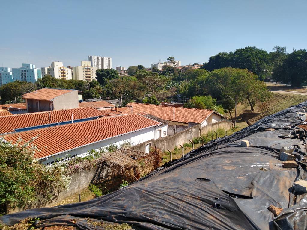 O que mais chama a atenção é uma extensa lona plástica estendida sobre uma encosta que praticamente engolida pela erosão.