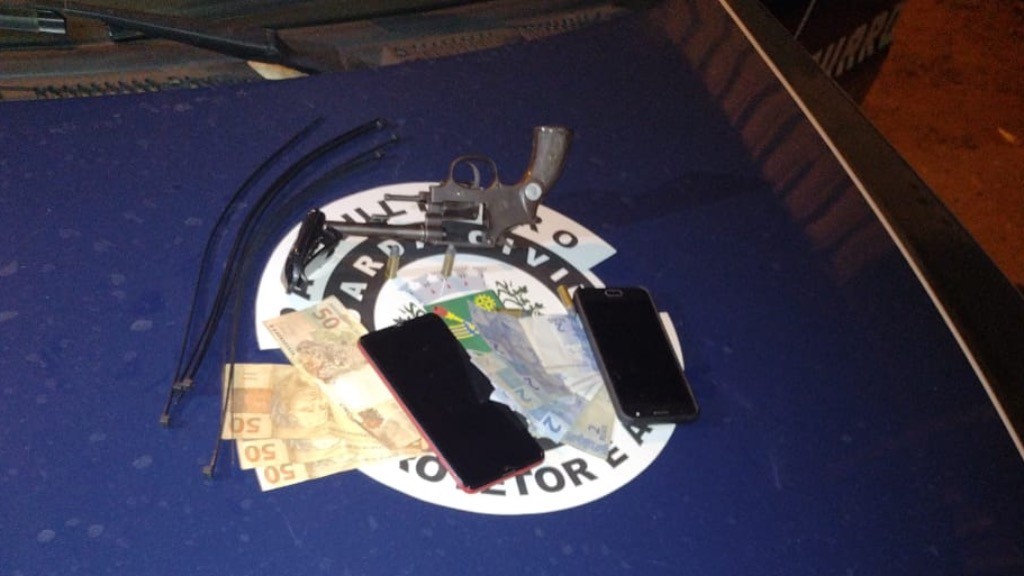 Uma pistola calibre 32, quatro munições e dois celulares foram apreendidos e os pertences da família, recuperados. Apesar da situação, as vítimas não se feriram.