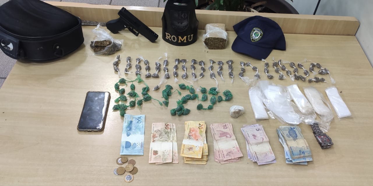 Foram apreendidas a arma falsa, dinheiro levado dos postos e porções de drogas. O homem já tinha passagens anteriores por roubos em comércios da cidade