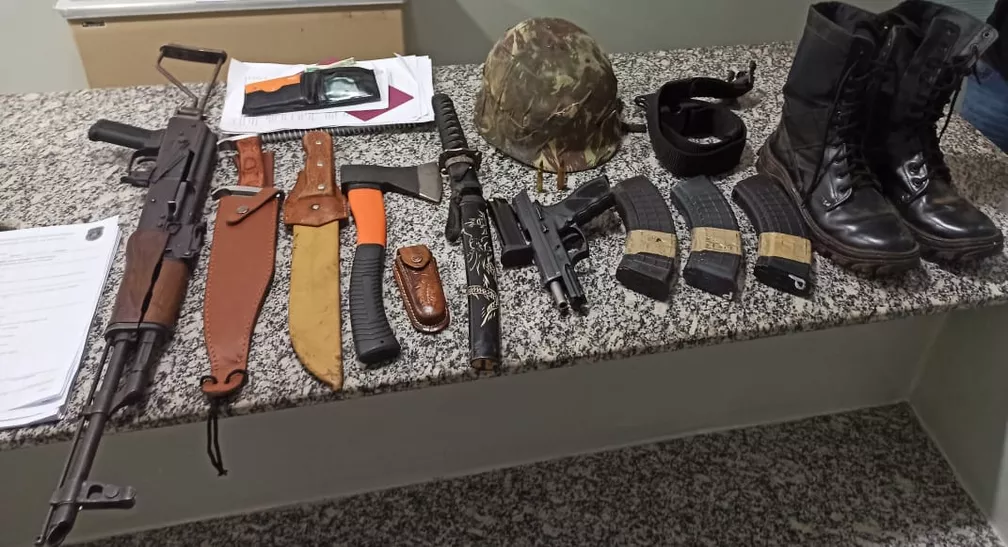 Na residência foram encontrados um fuzil AK-47, uma pistola calibre 380, 3 carregadores de fuzil 762, 28 balas de fuzil 762, munição de outros calibres como 556, 380 e 9mm, um capacete balístico e um par de coturno tático.