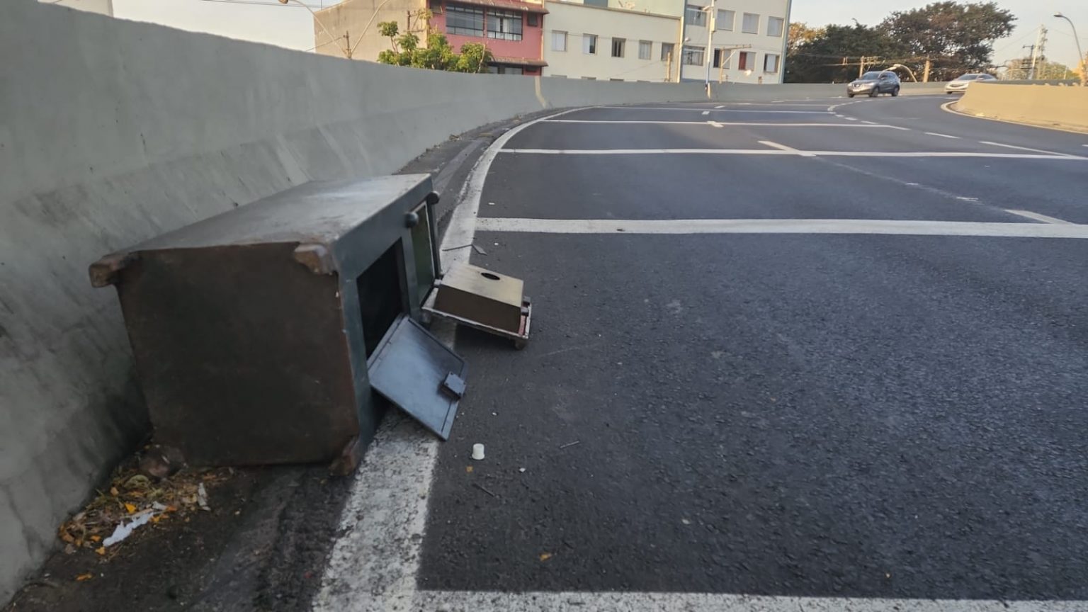 Segundo o dono, o cofre, que estava vazio, não tinha uso e os criminosos arrombaram uma sala para pegá-lo e provavelmente deve ter caído de um veículo que o transportava.