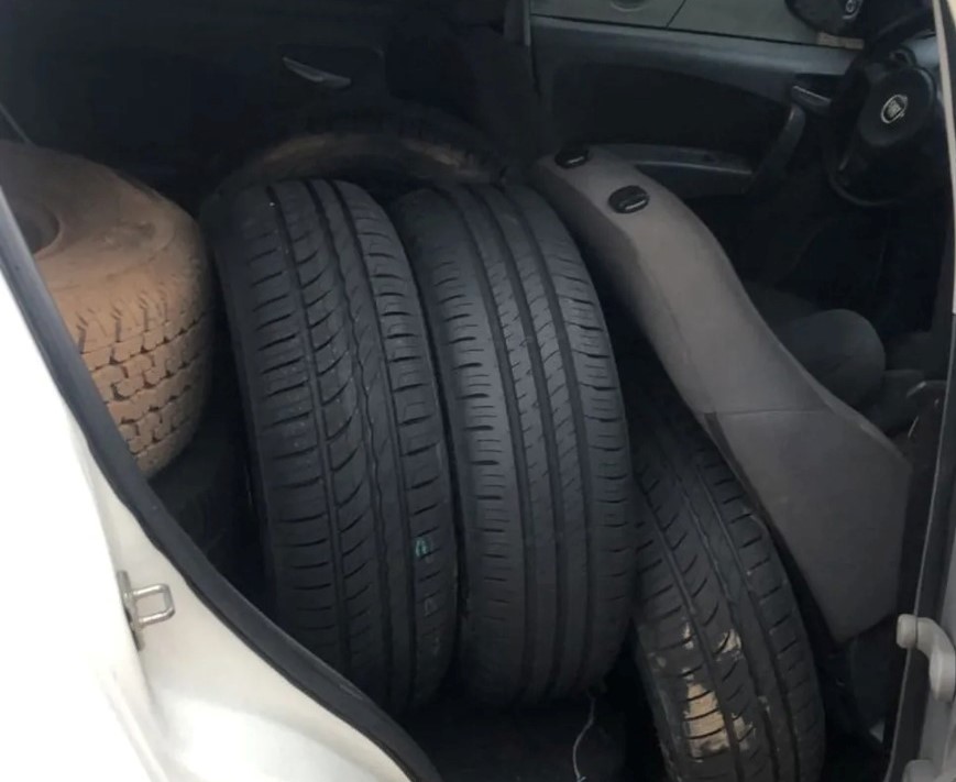 A corporação fez a abordagem e, no interior do carro, localizaram cinco pneus de carros de passeio e outros dois de caminhonete. Além dos pneus, os policiais encontraram diversas ferramentas usadas para efetuar os furtos.