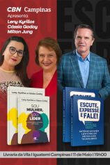 Os jornalistas Milton Jung e Cássia Godoy, apresentadores do Jornal da CBN, lançam dois livros nesta quinta-feira em Campinas. Milton lança “Escute, expresse e fale!”, e Cássia “Sou mulher, sou líder”. Ambos os livros foram escritos em parceria com a fonoaudióloga da TV Globo SP e da rádio CBN, Leny Kyrillos.