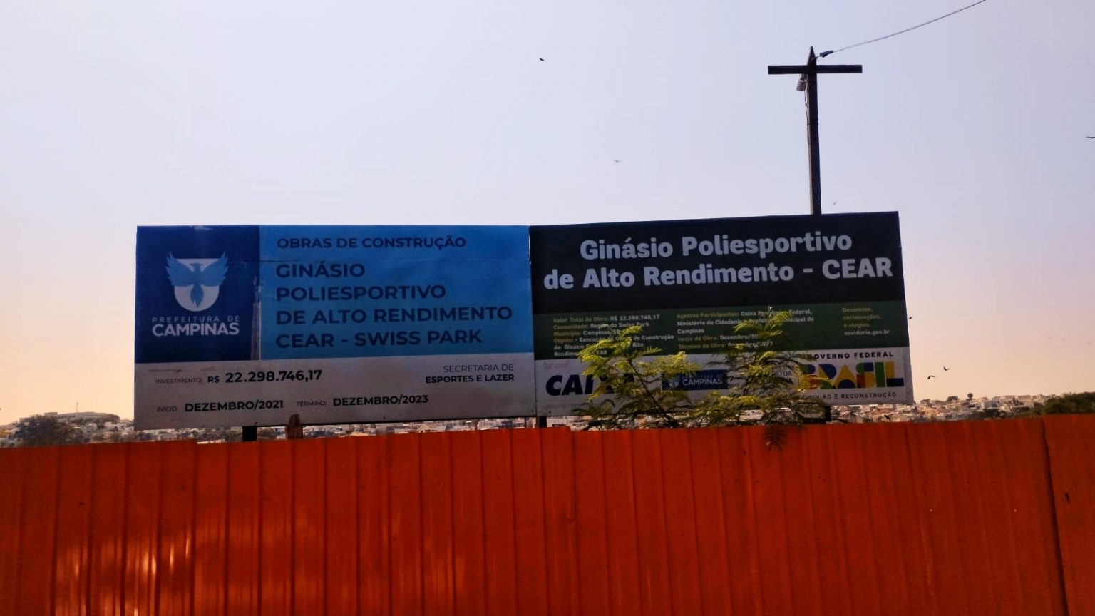 O Ginásio Poliesportivo de Alto Rendimento do CEAR, em Campinas, será entregue no ano que vem. No local existe uma placa em que consta que a obra foi retomada em dezembro de 2021 e deveria ser concluída em dezembro deste ano.