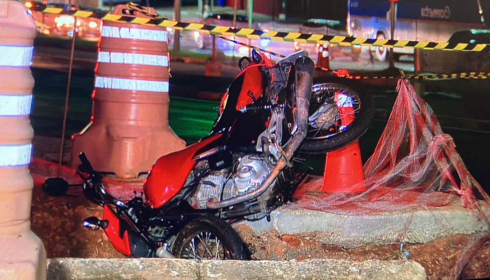 A moto, atingida por um veículo, caiu no canteiro de obras de um viaduto.