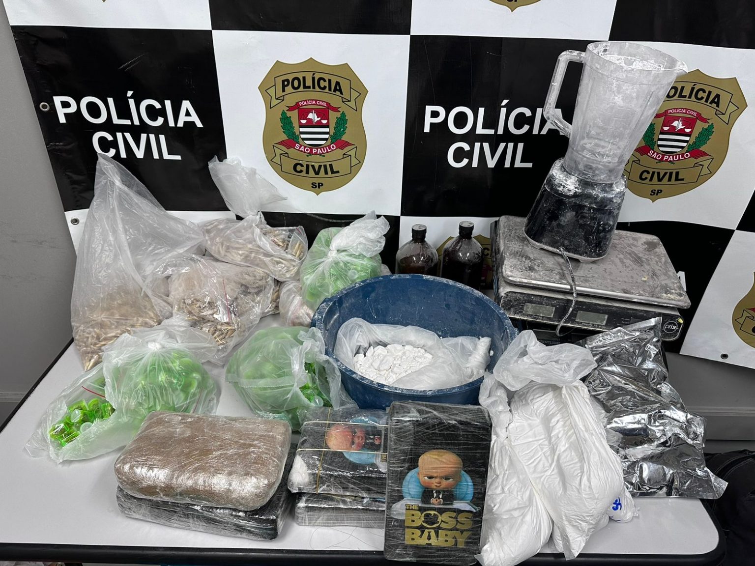 Foi aí que os policiais encontraram as drogas e materiais usados para preparar e embalar os entorpecentes. Ao todo, quase 7kg de cocaína, crack e 5kg de maconha foram localizados, assim como cadernos e anotações sobre o tráfico.