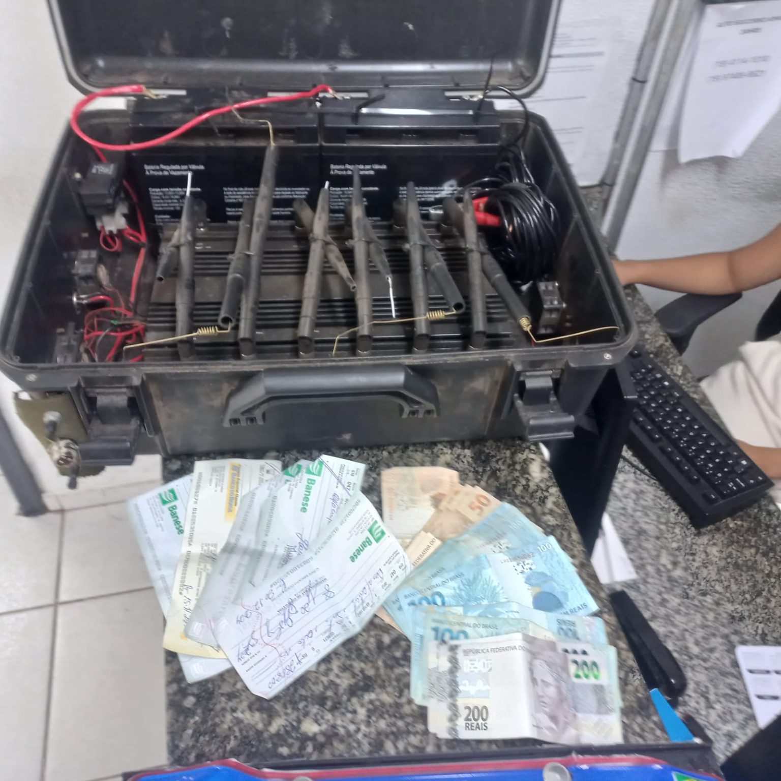 Dentro, foram localizadas as placas originais do caminhão, R$ 2.050 em dinheiro, cinco cheques totalizando R$ 12.090, dois celulares e um aparelho bloqueador de sinal de celular.