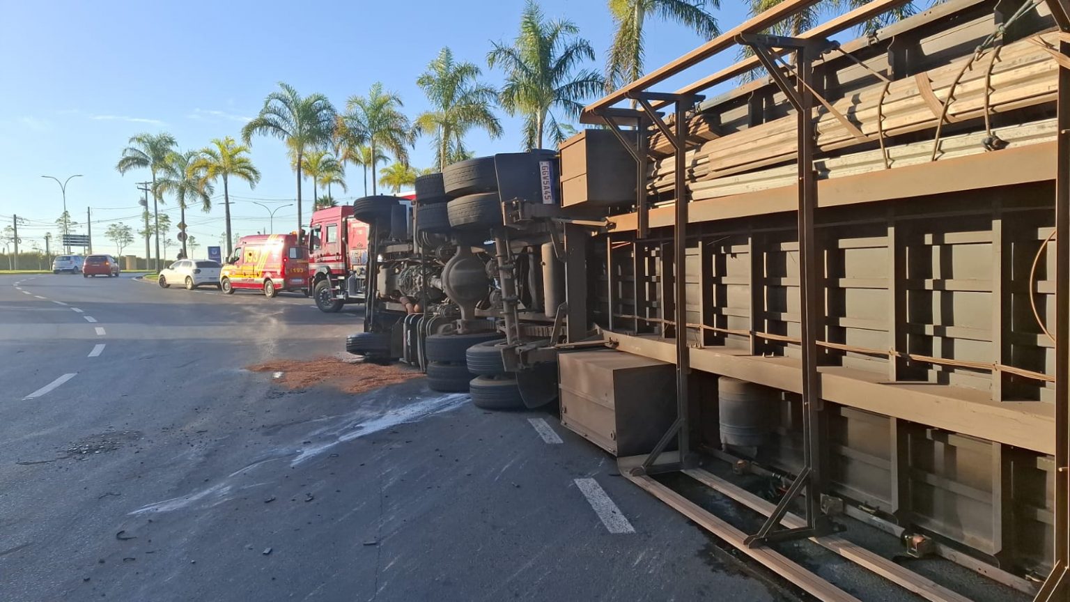 A motorista contou que estava fazendo a curva quando a carga se movimentou, provocando o tombamento da carreta.