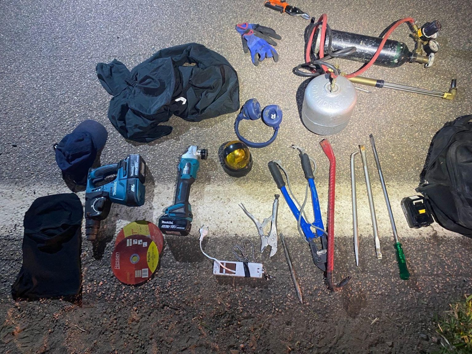 Na vistoria, os policiais encontraram toucas balaclava, luvas, uma alavanca, alicates e um maçarico; materiais, que segundo a polícia, indicam possível preparação para crimes.