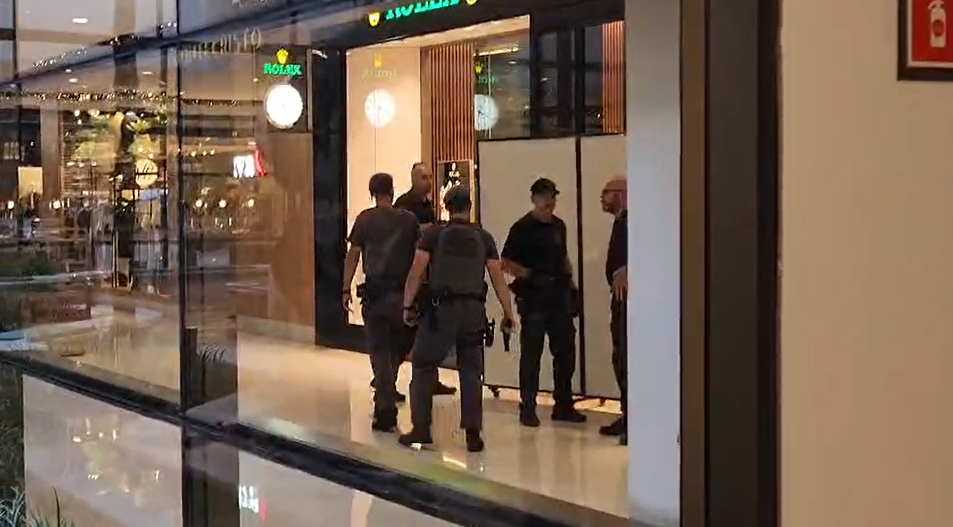 O estabelecimento, especializado em relógios de luxo, fica localizado no térreo e foi totalmente isolado pela equipe de segurança do shopping e pela Polícia Militar. Um helicóptero Águia também foi deslocado para atender a ocorrência.