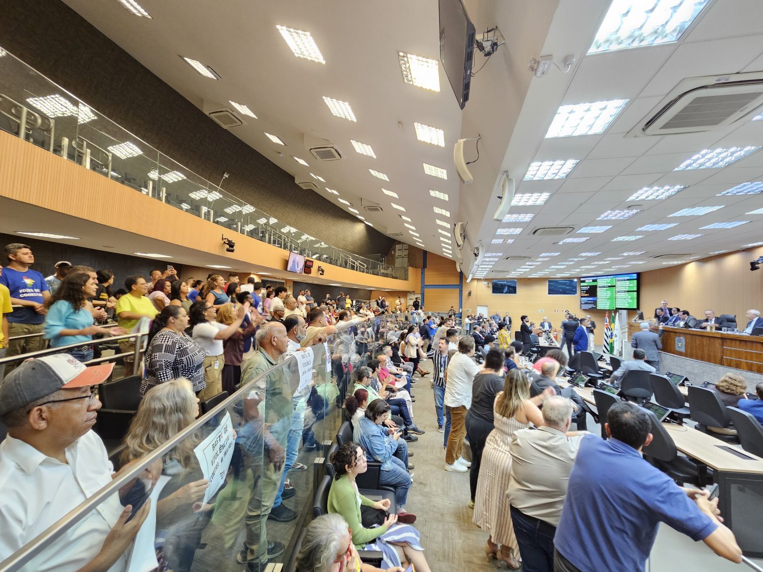 As galerias do Plenário ficaram lotadas para acompanhar a votação, onde manifestantes gritaram palavras de ordem ao longo dos discursos dos vereadores no chamado “primeiro expediente”, quando as pautas prioritárias do dia são apresentadas.
